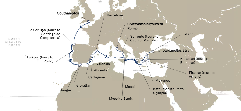 19 puertos de Southampton (Londres) a Civitavecchia (Roma)