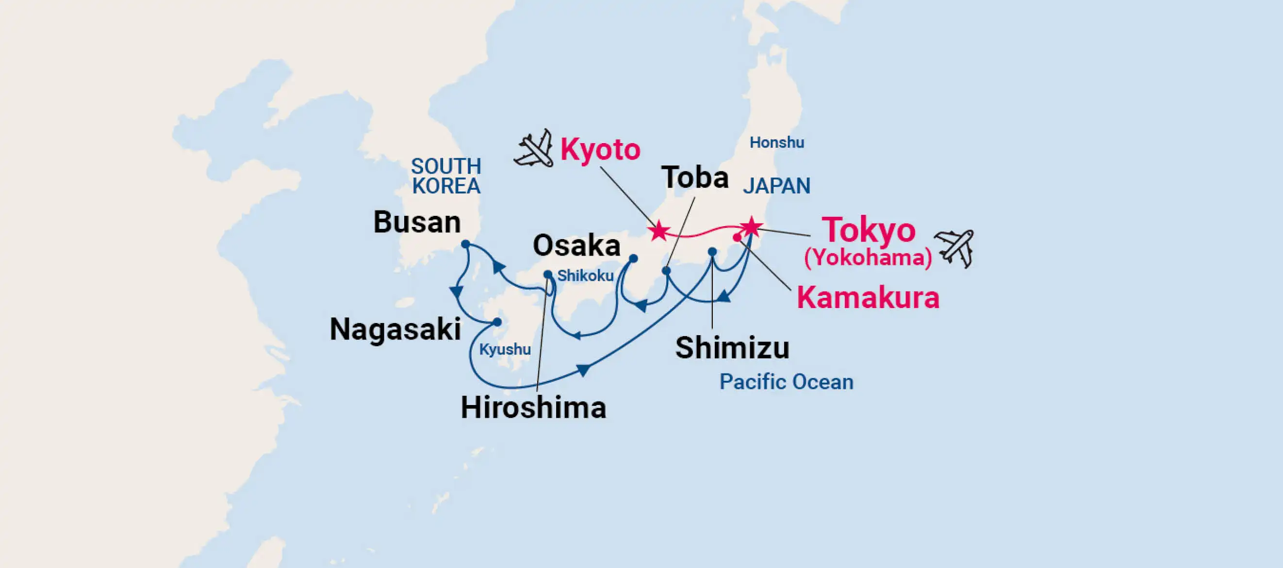 Este viaje contará con VUELOS desde Madrid, Barcelona o Lisboa, HOTELES, VISITAS, CRUCERO a bordo del Diamond Princess, TRASLADOS Y EXCURSIONES OPCIONALES.