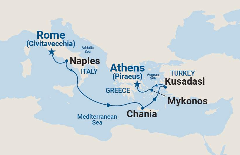 6 ports from Civitavecchia (Rome) to Pireo (Athens)