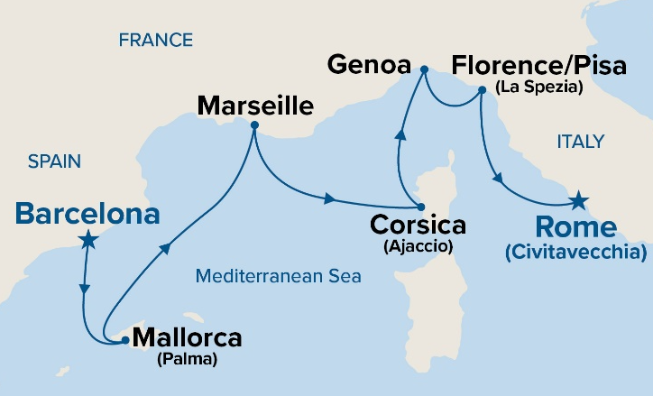 7 ports from Barcelona to Civitavecchia (Rome)